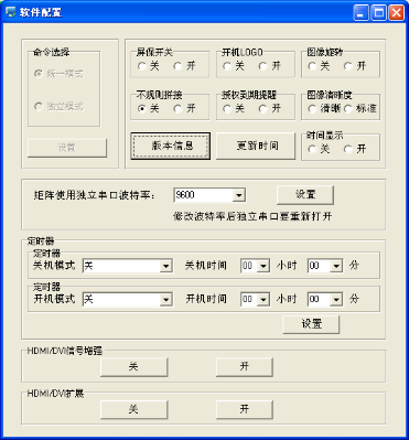 解壓拼接控制軟件、RAR得到以下三個文件:userlogo、VGA自動調整圖片、串口調試、LCDWall.exe、LcdWall.exe.manifest、MWS_Cfg.ini,該控制軟件為綠色版,無需安裝,直接運行Lcdwall軟件.exe,彈出如圖1控制界面。(注:所有操作必須在串口打開才能操作)
