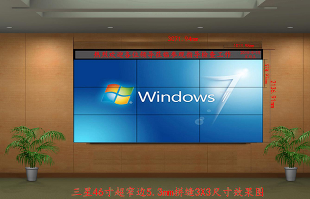 拼接墻的大小由幕墻單元的個數 (長M×高N) 和單元的尺寸來計算。例如3行x3列 46″超窄邊拼接墻共9個46″窄邊拼接單元組成,其大致尺寸及占用空間計算如下: